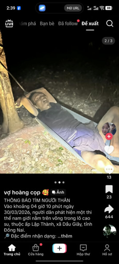 Vào khoảng 04 giờ 10 phút ngày 30/03/2026, người dân phát hiện một thi thể nam giới nằm trên võng trong lô cao su, thuộc ấp Lập Thành, xã Dầu Giây, tỉnh Đồng Nai.
